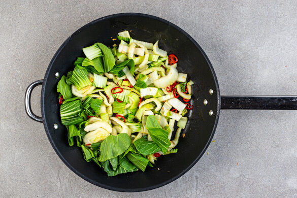 In einer großen Pfanne oder einem Wok 2EL Pflanzenöl und das Sesamöl bei mittlerer Hitze erwärmen. Die Peperoni und den Knoblauch ca. 1Min. im heißen Öl anbraten, dann die weißen Pak-Choi-Streifen hinzugeben und 1–2Min. unter Rühren braten. Dann den übrigen Pak Choi zugeben und ca. 2Min. braten. Mit 1 Prise Salz und Pfeffer würzen.