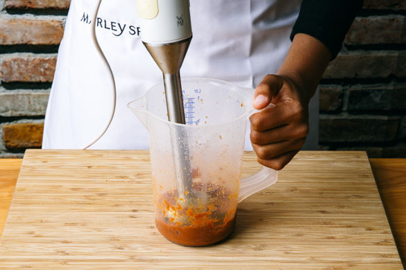 Den Grillbackofen auf 220°C vorheizen. Den Fisch ggfs. von Gräten befreien. Die Spieße im Wasser einweichen. Die getrockneten Tomaten mit 1-2EL Olivenöl, etwas Salz und Pfeffer so lange mit dem Stabmixer fein pürieren, bis eine cremige Pesto entstanden ist. Ggfs. etwas Wasser hinzufügen.