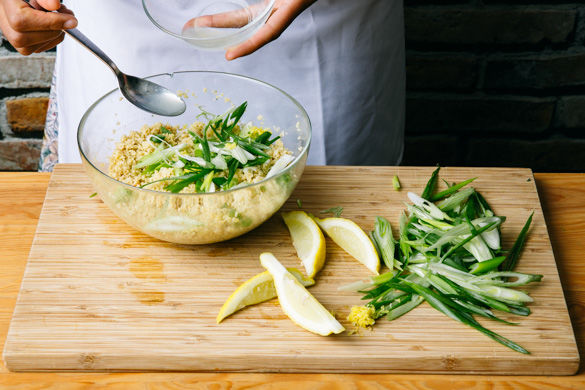Nun die Lauchzwiebeln in feine Streifen schneiden. Die Schale einer halben Zitrone abreiben, eine Hälfte der Zitrone entsaften, die zweite in Spalten schneiden. Den Couscous mit einer Gabel auflockern und mit Lauchzwiebeln, Abrieb und Saft der Zitrone sowie 1EL Olivenöl, Salz und Pfeffer abschmecken. Mit Gemüse, Spieße und Zitronenspalten servieren.