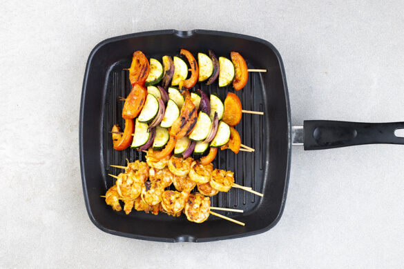 Die Gemüsespieße in einer Grillpfanne oder normalen Pfanne bei starker Hitze 7–10Min. braten, bis das Gemüse goldbraun und gar ist. Die Garnelenspieße gegen Ende der Garzeit dazugeben und auf jeder Seite ca. 1Min. braten, bis die Garnelen durch sind.