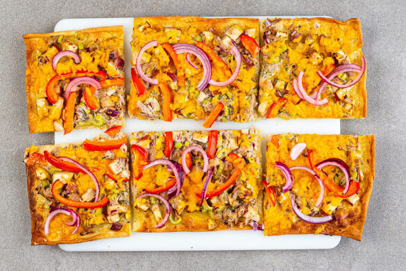 Hurra, es ist Flammkuchentag! Wie immer macht die Zubereitung auch den jüngeren Köchen Spaß, denn das Belegen gelingt einfach jedem. Die heutige cremige Melange aus Thunfisch, aromatischem Estragon, würzigem Sellerie und fruchtigem Apfel lässt sich ganz einfach auf dem Teig verteilen. Nun werden Paprikastreifen und zart schmelzender Cheddar darüber gestreut – und ab geht es in den Ofen. Einfach lecker!