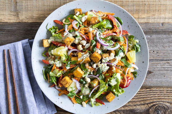 Wir sind verliebt in diesen Thai-Salat, der eine wahre Geschmacksbombe ist! Probier es aus und verfalle auch du der tollen Mischung aus fruchtiger Ananas, gerösteten Cashews, einem knackigen Gemüsemix aus Karotte, Paprika und roter Zwiebel sowie köstlichem Tofu und aromatischem Koriander.