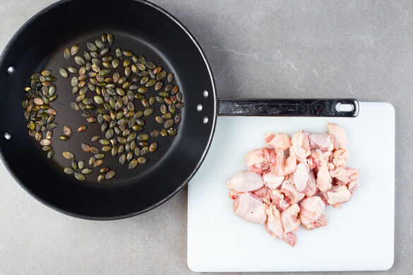 Die Kürbiskerne in einer großen Pfanne ohne Zugabe von Fett 2–4Min. anrösten, bis sie knistern und goldbraun sind. Zum Abkühlen aus der Pfanne nehmen. Das Fleisch trocken tupfen und in 2–3cm große Würfel schneiden. In einem mittelgroßen Topf ausreichend gesalzenes Wasser für die Pasta zum Kochen bringen.