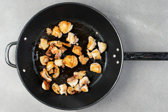 Die Kürbiskerne in einer großen Pfanne ohne Zugabe von Fett 2–4Min. anrösten, bis sie knistern und goldbraun sind. Zum Abkühlen aus der Pfanne nehmen. Das Fleisch trocken tupfen und in 2–3cm große Würfel schneiden. In einem großen Topf ausreichend gesalzenes Wasser für die Pasta zum Kochen bringen.