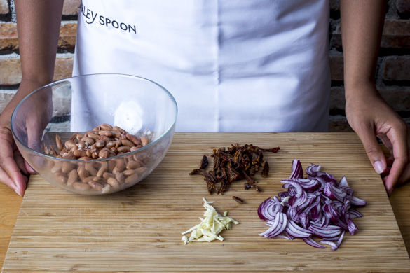 Die Zwiebel und den Knoblauch schälen, halbieren und in feine Streifen schneiden. Die getrockneten Tomaten und Bohnen abtropfen lassen, die Tomaten ebenso in feine Streifen schneiden.
