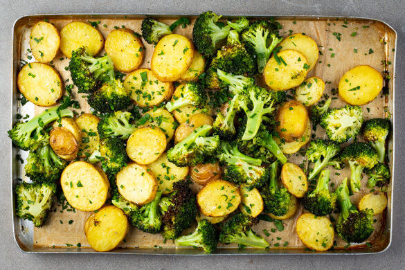 Den Brokkoli mit 2EL Zitronensaft, 1EL Pflanzenöl und je 1 kräftigen Prise Salz und Pfeffer vermengen. Auf das Backblech mit den Kartoffeln geben, 10–12Min. bevor diese gar sind, und mitbacken.