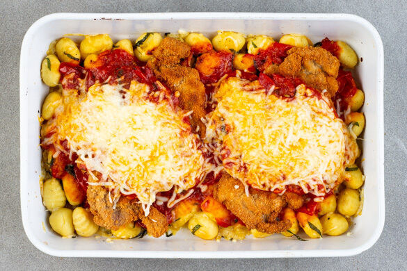 Die Sauce mit Salz, Pfeffer und 1 Prise Zucker abschmecken und das restliche Basilikum unterrühren. Die ½ der Sauce über die Gnocchi geben, dann die Schnitzel auf die Gnocchi legen und mittig mit der übrigen Sauce bedecken. Den restlichen Gouda darauf verteilen und die Schnitzel 6–7Min. überbacken, bis der Käse geschmolzen ist.
