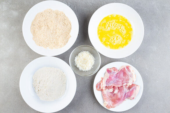Das Fleisch trocken tupfen und zwischen zwei Lagen Frischhaltefolie oder Backpapier mit einer schweren Pfanne ca. 0,5cm dünn plattieren. Den Hartkäse fein reiben. 2EL Mehl auf einen Teller geben, auf einem weiteren Teller 1 Ei verquirlen, auf einem dritten Teller das Paniermehl mit der ½ des Hartkäses sowie je 1 Prise Salz und Pfeffer vermengen.