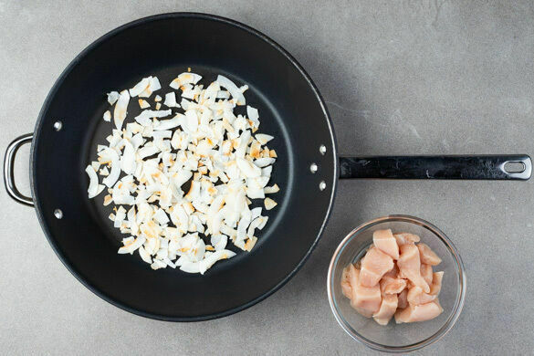 In einem mittelgroßen Topf ausreichend gesalzenes Wasser für die Nudeln zum Kochen bringen. Die Kokosflocken in einer großen Pfanne ohne Zugabe von Fett bei mittlerer Hitze 1–2Min. goldbraun anrösten, zum Abkühlen aus der Pfanne nehmen und beiseitestellen. Die Pfanne aufbewahren. Das Fleisch trocken tupfen und in 1–2cm große Stücke schneiden.