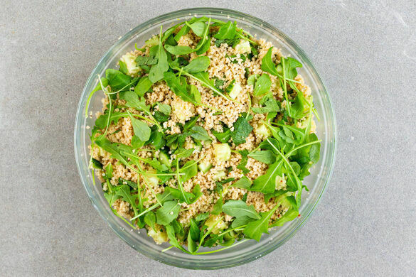 Achtung, hier kommt ein wahres Spektakel für deine Geschmacksknospen! Geräuchertes Hähnchenfleisch trifft auf gebackene grüne Bohnen, pikanten Käse und geröstete Haselnüsse. Dazu gibt es einen erfrischenden Couscous-Mix mit Rucola, Gurke, Zitrone und Minze. Guten Appetit!