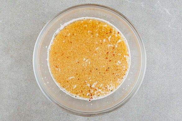 Den Couscous mit dem Knoblauch, 4EL Zitronensaft, 1TL Gewürzmischung, 1/2TL Salz und 1 kräftigen Prise Pfeffer in einer Schüssel vermengen. Das kochende Wasser über den Couscous gießen, umrühren und den Couscous abgedeckt 8–10Min. quellen lassen. Mit einer Gabel auflockern und abkühlen lassen.