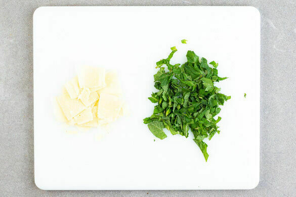 Den Käse mit einem Sparschäler oder Käsehobel in breite Streifen schneiden. Die Minzeblätter von den Stängeln zupfen und in grobe Streifen schneiden.