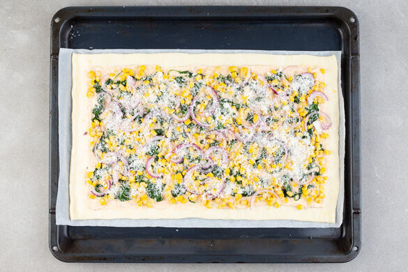 Die Teige mit dem Papier nach unten auf zwei Backblechen ausrollen und mit der Käsecreme bestreichen, dabei am Rand ca. 1cm frei lassen. Die Randstreifen mit insg. 2TL Olivenöl bestreichen. Den Spinat gleichmäßig auf der Creme verteilen, dann den Mais, die Zwiebeln und den restlichen Käse auf den Pizzen verteilen und die Pizzen 12–14Min. im Ofen knusprig backen.