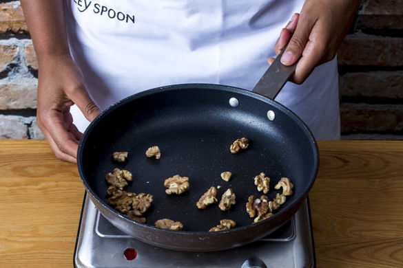 Inzwischen die Walnüsse in einer kleinen Pfanne rösten. Sobald die gegrillte Paprika abgekühlt ist, die Paprikahaut abziehen und grob in Würfel schneiden. Von dem Brötchen je eine der Enden abschneiden oder abreißen und in etwas Wasser einweichen.