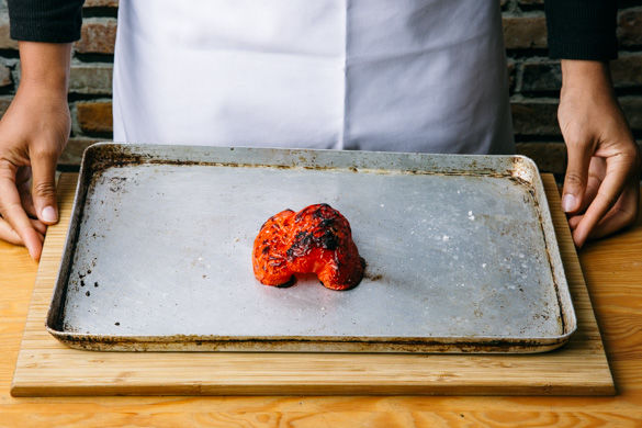 Den Grill auf 250°C vorheizen. Paprika halbieren und entkernen, eine Hälfte mit der Schale nach oben auf ein Backblech legen. Die Paprika mit etwas Öl und Salz besprenkeln und im Ofen ca. 12-15Min. backen, bis die Haut Blasen wirft. Aus dem Ofen nehmen und in einer Plastiktüte abkühlen lassen. Den Ofen auf 200°C Umluft oder 220°C Ober-/Unterhitze umstellen.