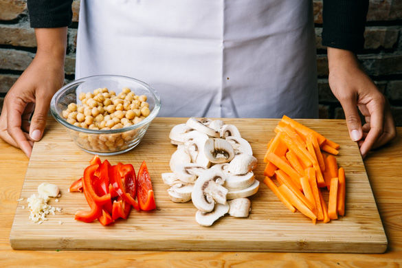 Inzwischen die Karotten schälen, längs vierteln und nochmal quer halbieren. Die zweite Paprikahälfte entkernen und in ca. 1-2cm dünne Stifte schneiden. Die Pilze ggfs. von Schmutz befreien und in ca. 0,5-1cm dicke Scheiben schneiden. Den Knoblauch schälen und halbieren, eine Hälfte grob hacken. Die Kichererbsen gut abtropfen lassen.