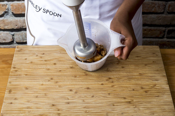 Nun die geschälte Paprika mit Granatapfelmolasse, der restlichen Knoblauch-Hälfte und den gerösteten Walnüssen in ein hohes Behältnis geben. Das überschüssige Wasser des eingeweichten Brotes mit den Händen auswringen und hinzufügen, dann mit einem Stabmixer zu einer cremigen Paste pürieren, mit Salz und Pfeffer abschmecken.