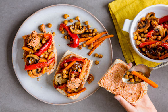 Diese Brötchen werden mit der aus Syrien stammenden Muhammara-Paste aus gerösteter Paprika, Brot, Granatapfelsirup und Walnüssen serviert. Das gibt deinem Sandwich das besondere Etwas, wenn du es dick bestreichst und mit Karotten, Pilzen und dem Eiweiß-Lieferant Kichererbsen nach deinem eigenen Gusto belegst! PS "Eat Green": Für jede Bestellung von diesem Gericht spendet Marley Spoon 0.10€ an die Berliner Tafel!