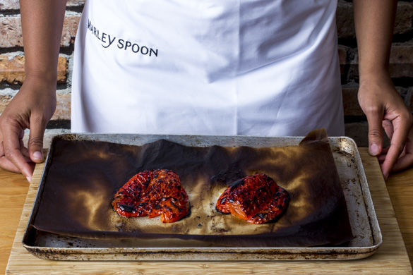 Den Grill auf 250°C vorheizen. Paprika halbieren und entkernen, eine Paprika mit der Schale nach oben auf ein Backblech legen. Die Paprika mit etwas Öl und Salz besprenkeln und im Ofen ca. 12-15Min. backen, bis die Haut Blasen wirft. Aus dem Ofen nehmen und in einer Plastiktüte abkühlen lassen. Den Ofen auf 200°C Umluft oder 220°C Ober-/Unterhitze umstellen.