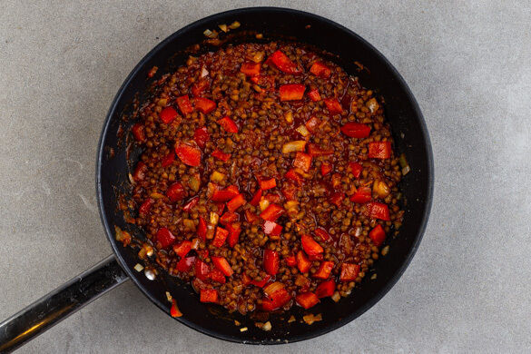 Die Zwiebeln und die Paprika in derselben Pfanne mit 1EL Olivenöl bei mittlerer Hitze in 5–7Min. weich braten. Den Knoblauch schälen und fein reiben, dann mit der Gewürzmischung, dem Tomatenmark und 1 Prise Zucker in die Pfanne geben und ca. 1Min. mitbraten. Die Linsen und 100ml Wasser dazugeben und ca. 2Min. erwärmen. Mit Salz und Pfeffer abschmecken.