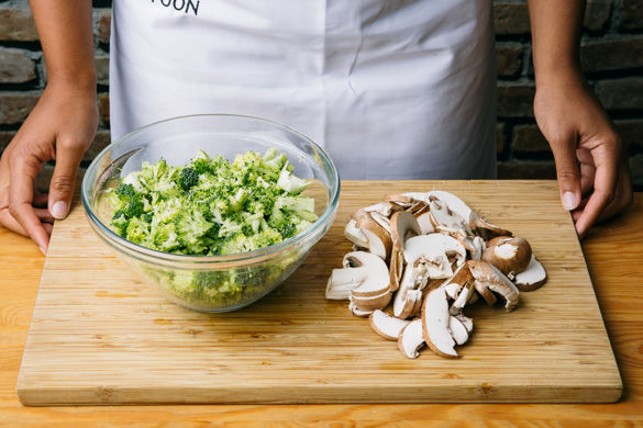 Den Brokkoli in ca. 1cm große Stücke schneiden. Die Pilze mit einer Bürste oder feuchtem Küchenkrepp von evtl. Schmutz befreien und in Scheiben schneiden.