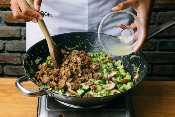Eine schnelle Nudel-Pfanne zum Abendessen? Das ist fix gekocht, einfach, herzhaft und super lecker. Probier es aus mit dieser asiatischen Variante mit gebratenem Schweinehackfleisch mit Sojasauce, Brokkoliröschen und Champignons. Dazu gibt es knackige Erdnüsse.
