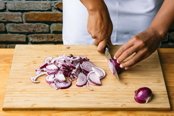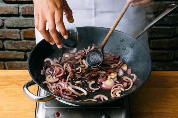 Den Backofen auf 200°C Umluft vorheizen. Die Zwiebeln schälen, halbieren und in ca. 0,5-1cm dicke Streifen schneiden.