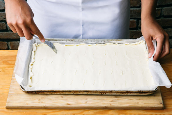 Die Blätterteige mit Papier auf zwei Backbleche ausrollen und den Rand ca. 1cm dick einrollen und mehrmals mit einer Gabel einstechen.