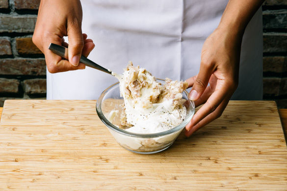 In der Zwischenzeit die Forelle mit einer Gabel zerdrücken, dabei auf Gräten achten und diese ggfs. entfernen. Die Forelle mit dem Schmand verrühren und mit etwas Salz und Pfeffer abschmecken.
