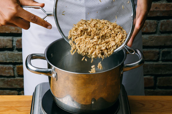 400ml leicht gesalzenes Wasser in einem mittelgroßen Topf zum Kochen bringen. Den Reis in einem Sieb unter fließendem Wasser abspülen, bis das Wasser klar bleibt. Sobald das Wasser kocht, den Reis auf niedrigster Stufe abgedeckt ca. 10–12Min. kochen, bis das Wasser aufgesogen und der Reis bissfest ist. Noch ca. 5Min. ohne Hitzezufuhr abgedeckt ziehen lassen.