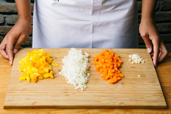 Währenddessen die Paprika halbieren, entkernen und in 1–2cm große Würfel schneiden. Die Zwiebel schälen, halbieren und fein hacken. Die Karotten schälen, die Enden abschneiden, dann die Karotten längs vierteln und in ca. 1cm große Würfel schneiden. Den Knoblauch schälen und grob hacken.