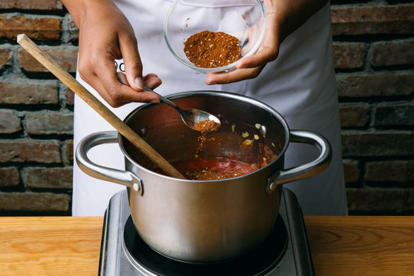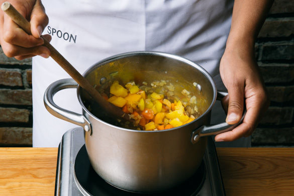 Das Gemüse mit den gehackten Tomaten und 150ml Wasser ablöschen und ca. die 1/2 der Gewürzmischung unterrühren. Das Gemüse abgedeckt ca. 8–10Min. bei mittlerer Hitze köcheln lassen.