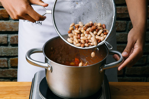 Die Bohnen in einem Sieb abtropfen lassen und in das Chili geben. Das Chili mit Salz, Pfeffer und 1 Prise Zucker abschmecken und weitere 4–5Min. köcheln lassen. Sollte der Reis jetzt noch nicht gar sein, kann das Chili auf niedriger Hitze leicht weiter köcheln, bis der Reis fertig ist.