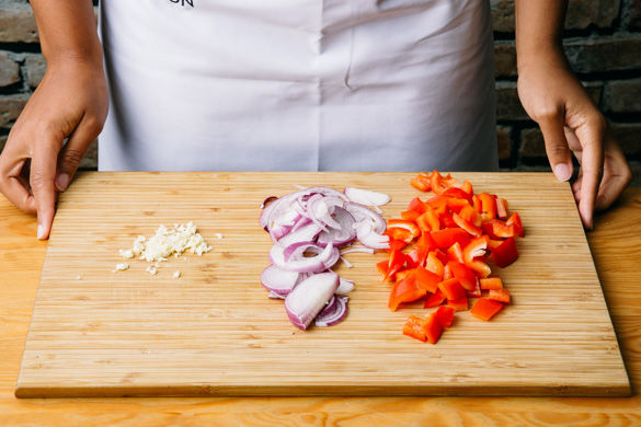 In einem mittelgroßen Topf ausreichend gesalzendem Wasser für die Pasta zum Kochen bringen. Inzwischen die Paprika entkernen und in ca. 1-2cm große Würfel schneiden. Die Zwiebeln schälen, halbieren und in feine Streifen schneiden. Den Knoblauch schälen und grob hacken.