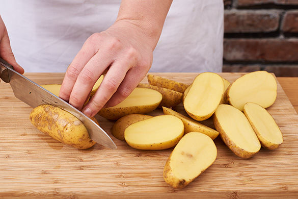 Den Backofen auf 200°C Umluft (220°C Ober-/Unterhitze) vorheizen. Die Kartoffeln der Länge nach halbieren.