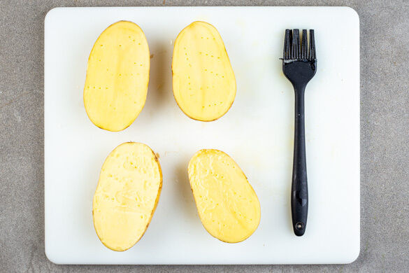 Den Backofen auf 240°C (220°C Umluft) vorheizen. 1EL Butter in einer mittelgroßen Pfanne schmelzen lassen. Die Kartoffeln samt Schale längs halbieren, dann mit einer Gabel von beiden Seiten mehrmals einstechen. Die Kartoffeln mit der geschmolzenen Butter bepinseln und großzügig mit Salz und Pfeffer würzen. Die Pfanne aufbewahren.