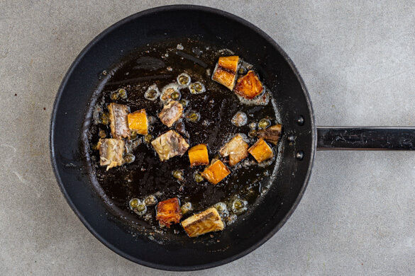Die Makrele mit einem scharfen Messer von der Haut befreien und in mundgerechte Stücke zupfen, dabei evtl. größere Gräten entfernen. ½EL Butter in der Pfanne bei mittlerer Hitze schmelzen. Sobald die Butter heiß ist, die Makrele und die Kapern in die Pfanne geben und in 3–5Min. weich braten.