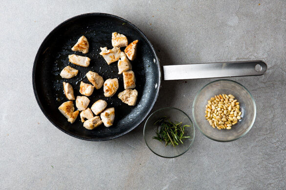 Die Pinienkerne in einer mittelgroßen Pfanne ohne Fett bei mittlerer Hitze 1–2Min. anrösten, dann herausnehmen. In derselben Pfanne den restlichen Rosmarin mit 1EL Olivenöl 2–3Min. knusprig braten, dann auf etwas Küchenkrepp legen. Das Fleisch trocken tupfen, in mundgerechte Stücke schneiden und in dem Rosmarinöl mit je 1 Prise Salz und Pfeffer bei mittlerer Hitze 5–7Min. braten.