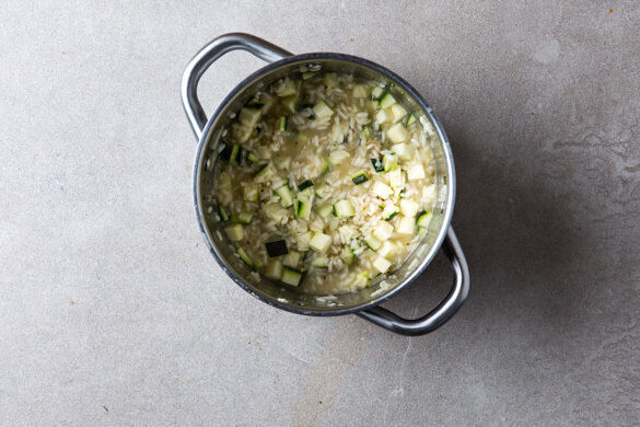 Den Knoblauch, 1TL Zitronenschale, den restlichen Zitronensaft, den gehackten Rosmarin und ca. 150ml Brühe hinzufügen. Nach und nach unter Rühren mehr Brühe zugeben und einköcheln lassen, bis die gesamte Flüssigkeit aufgebraucht ist und der Reis sämig ist, aber noch Biss hat, das dauert 18–20Min. Die Zucchini dazugeben, sobald die 1/2 der Brühe verbraucht ist.