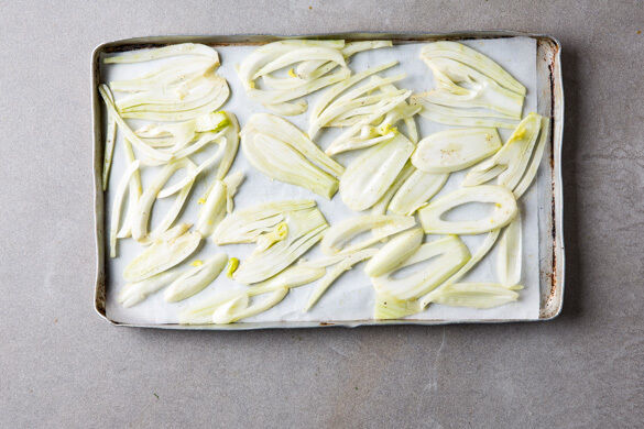 Den Fenchel auf einem mit Backpapier ausgelegten Backblech mit 1EL Olivenöl und je 1 kräftigen Prise Salz und Pfeffer vermengen, gleichmäßig verteilen und 15–20Min. im Ofen rösten, bis der Fenchel leicht gebräunt und gar ist. Den Fenchel aus dem Ofen nehmen und mit 1EL Zitronensaft beträufeln.