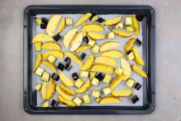 Den Backofen auf 230°C (210°C Umluft) vorheizen. Die Kartoffeln samt Schale in 1–2cm breite Spalten schneiden. Die Aubergine längs halbieren und in 1–2cm große Würfel schneiden. Die Kartoffeln und die Auberginenwürfel auf einem mit Backpapier ausgelegten Backblech mit 1EL Olivenöl, 1/2TL Salz und 1 Prise Pfeffer vermengen und 10–15Min. im Ofen vorbacken.