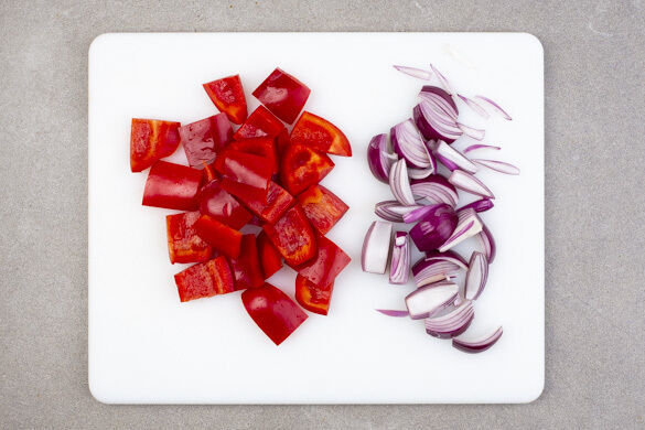 Die Paprika vierteln, entkernen und in grobe Stücke schneiden. Die Zwiebel schälen, halbieren und in dünne Spalten schneiden.