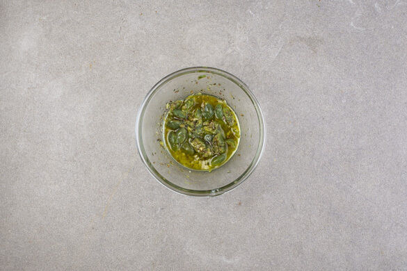 Den Knoblauch schälen und fein würfeln oder reiben. Die Zitronenschale fein abreiben. Die Oliven fein hacken und mit der 1/2 des Knoblauchs, 1TL Zitronenschale, den übrigen Provence-Kräutern und 1EL Olivenöl vermengen. Tipp: Wer keinen rohen Knoblauch mag, kann den Knoblauch vorher ca. 30Sek. in einer kleinen Pfanne mit etwas Olivenöl braten.