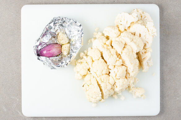 Den Backofen auf 220°C (200°C Umluft) vorheizen. Die Schalotte und den Knoblauch schälen, auf ein kleines Stück Alufolie legen, mit 1EL Olivenöl und 1 Prise Salz vermengen und dann zu einem Päckchen falten. Den Blumenkohl in ca. 2cm dicke Scheiben schneiden, dabei den harten Strunk entfernen. Die Blumenkohlscheiben in 2–3cm große Stücke schneiden.