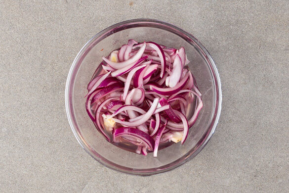 Die Zitronenschale abreiben, dann die Zitrone halbieren und auspressen. Die Zwiebel schälen, halbieren und in feine Streifen schneiden, dann mit 1EL Zitronensaft, 4EL hellem Essig, 1TL Salz und 1EL Zucker vermengen und beiseitestellen.
