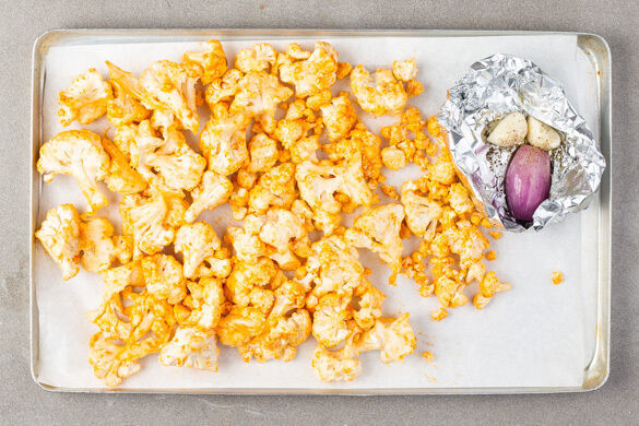 Den Backofen auf 220°C (200°C Umluft) vorheizen. Die Schalotten und den Knoblauch schälen, auf ein kleines Stück Alufolie legen, mit 2EL Olivenöl und 1 kräftigen Prise Salz vermengen und dann zu einem Päckchen falten. Die Blumenkohle in ca. 2cm dicke Scheiben schneiden, dabei den harten Strunk entfernen. Die Blumenkohlscheiben in 2–3cm große Stücke schneiden.