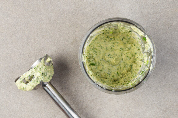 Den Dill und die Petersilie samt Stängeln grob schneiden und mit den Cashews, den Schalotten und dem Knoblauch samt Öl sowie dem restlichen Zitronensaft in einem hohen Gefäß mit einem Stabmixer glatt pürieren. Ggf. etwas Wasser hinzufügen, falls die Sauce zu dickflüssig ist und mit Salz und Pfeffer abschmecken.