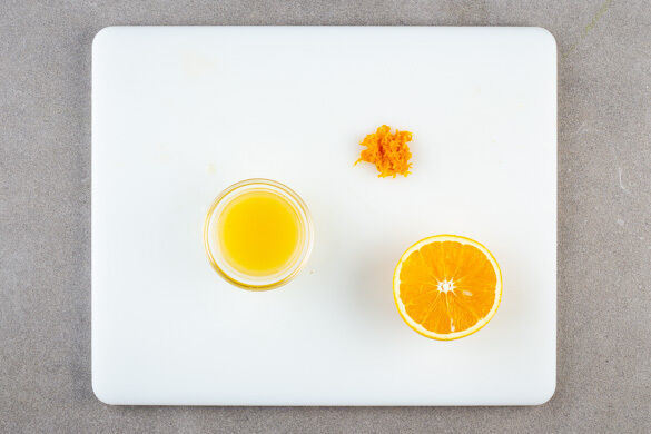 Die Orangenschale abreiben und die Orange halbieren, dann eine Hälfte auspressen, die andere Hälfte beiseitelegen.