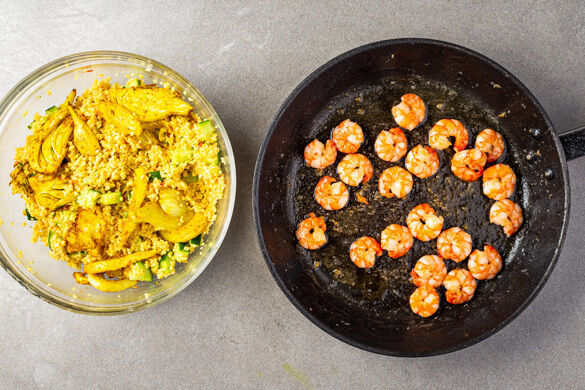 Die saftigen Garnelen werden auf einem Bulgursalat serviert, der vor mediterranem Flair nur so sprüht. Der Clou liegt hier im Kleingedruckten: Geröstete Tomaten werden mit Orangensaft und Madras-Currypulver zu einem fruchtig-pikanten Dressing verquirlt, das selbst müde Geschmacksgeister erwachen lässt!