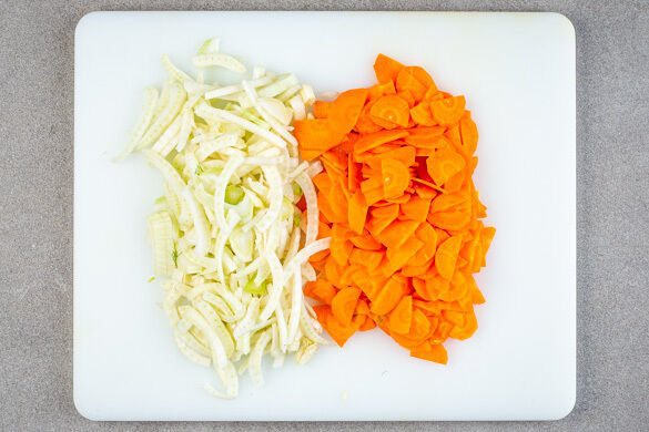 Den Fenchel längs vierteln, dann jeweils quer in feine Streifen schneiden, dabei den Strunk entfernen. Ggf. vorhandenes Fenchelgrün beiseitelegen. Die Karotte ggf. schälen, längs halbieren und quer in dünne Scheiben schneiden.